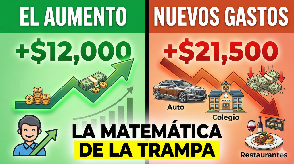 Piensa en tu último ascenso. Recibiste, digamos, $12,000 pesos extras al mes. En lugar de ahorrarlos, la trampa del estatus te empujó a cambiar el auto (+$9,500), mejorar el colegio de los niños (+$7,200) y pedir más comida a domicilio por falta de tiempo (+$4,800). Ese aumento «salvador» te generó $21,500 pesos en gastos nuevos.